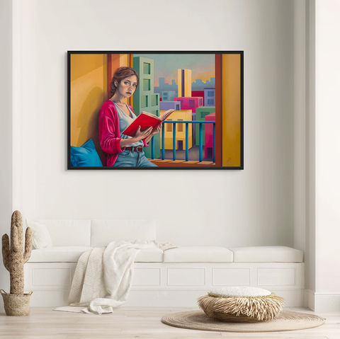 Tra il ritmo della città e la quiete del gesto, lei si ferma. Seduta tra linee colorate e volumi sospesi, tiene tra le mani un libro come un filo di respiro, un modo per abitare il proprio silenzio.